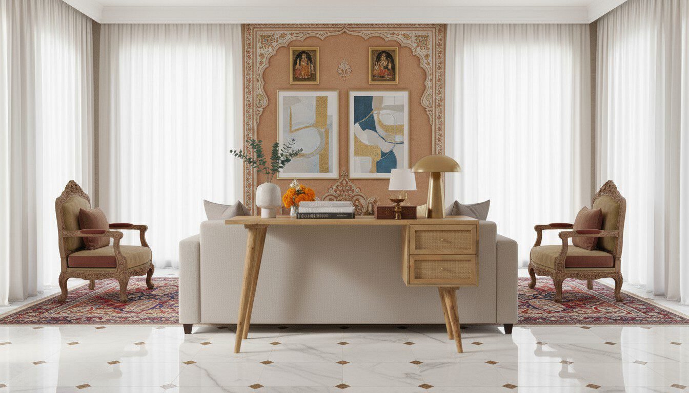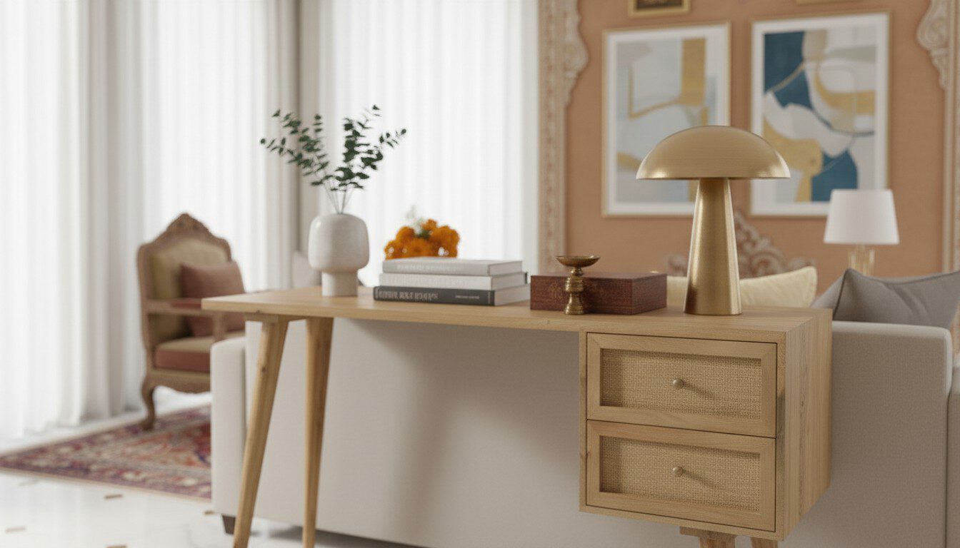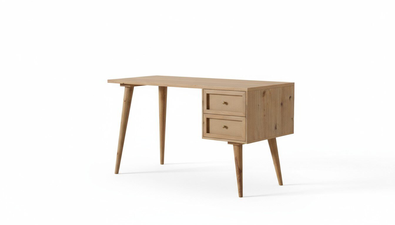 This exquisite desk, measuring 130.0 × 75.0 × 60.0 cm, is a testament to Dhvij International’s commitment to artisanal excellence. The warm, natural wood grain of the tabletop and legs is beautifully complemented by the intricate cane weaving on the two drawer fronts. This tactile and visually appealing detail adds a unique character, transforming a functional piece into a work of art. Each desk is meticulously crafted by our skilled artisans, embodying our philosophy that furniture should be alive and a conversation starter.