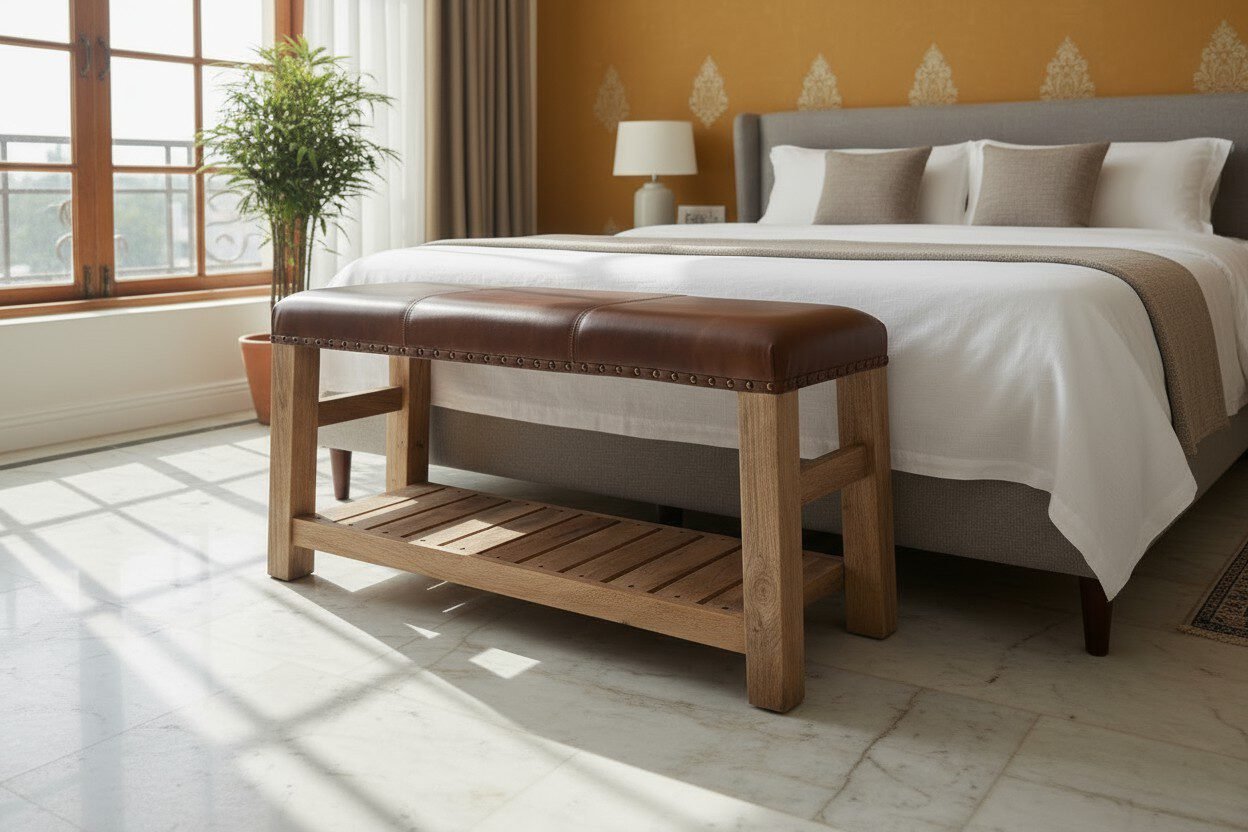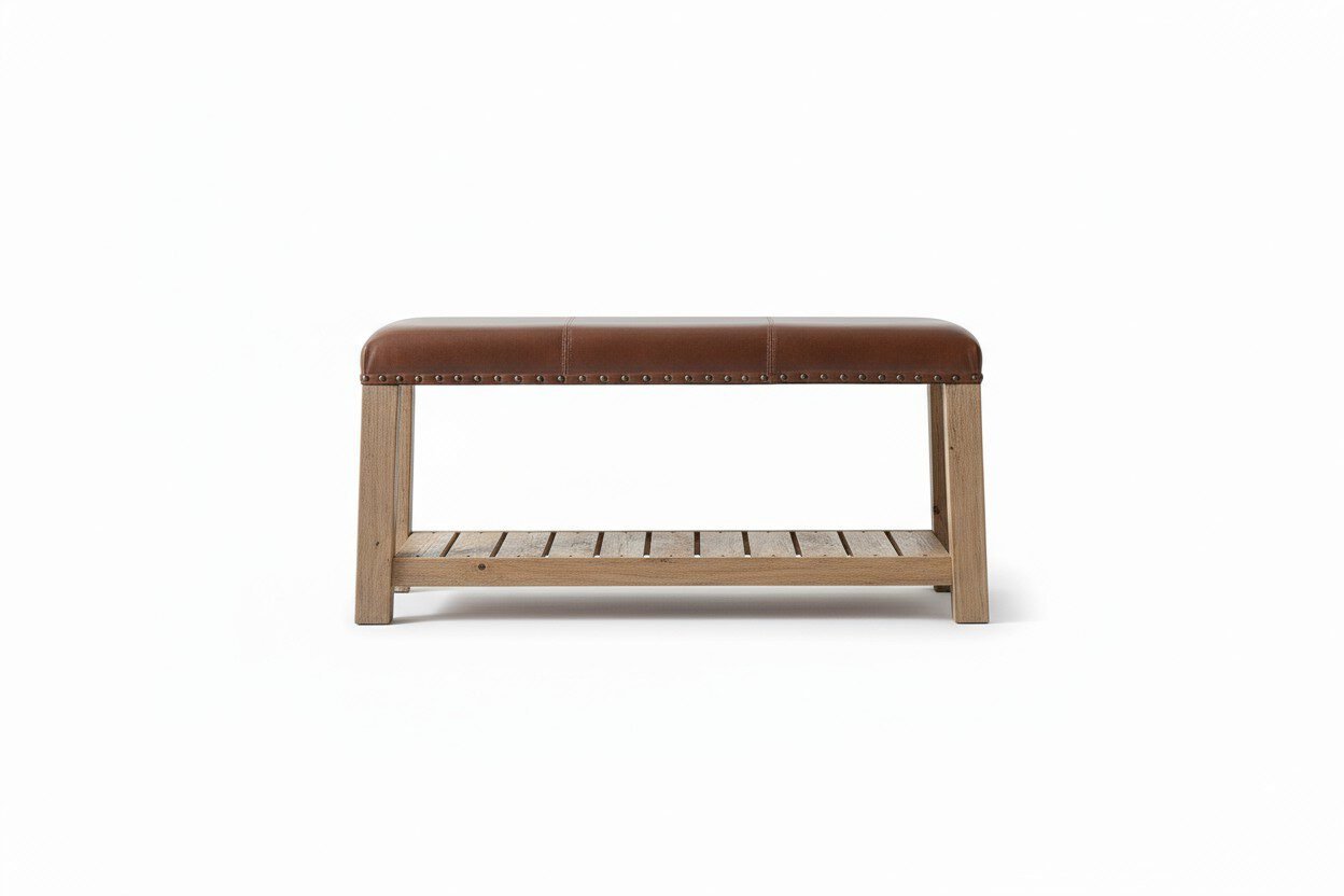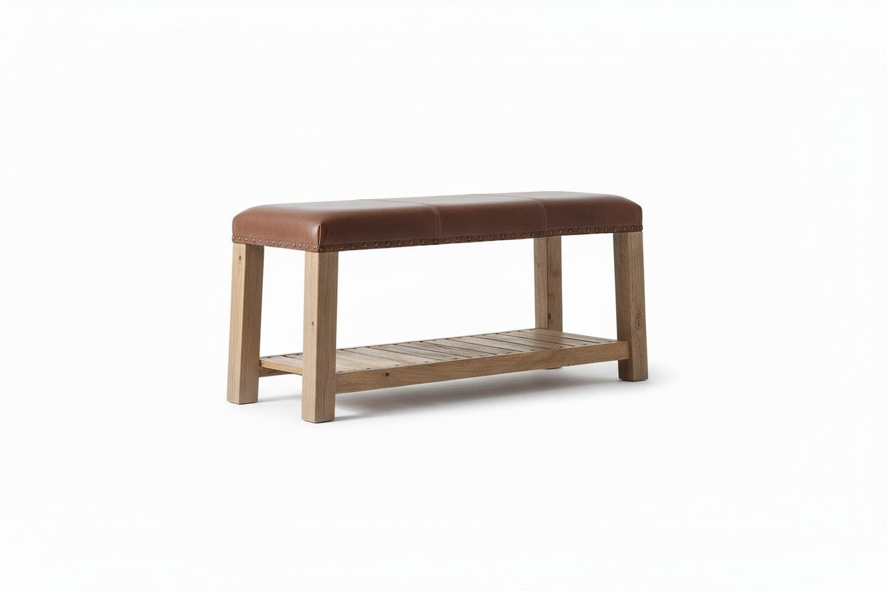 More than just a seating solution, this bench is conceived as a ‘classy showstopper.’ Its balanced design, with the warm tones of the leather and the earthy appeal of the wood, ensures it will ‘make every room come alive.’ The inclusion of a lower shelf adds a layer of functionality, making it perfect for entryways, living spaces, or even at the foot of a bed, inviting both admiration and practical use.