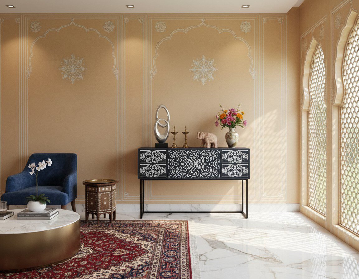 The Ornate Scroll Console is a testament to Dhvij’s commitment to creating ‘classy showstoppers.’ Crafted with meticulous attention to detail, this piece showcases a striking navy exterior adorned with a captivating white ornate scroll pattern. Each swirl and flourish is meticulously applied, drawing the eye and sparking admiration. The crisp white inlay against the deep navy creates a dramatic visual contrast, embodying our philosophy that furniture should be alive and a conversation starter.