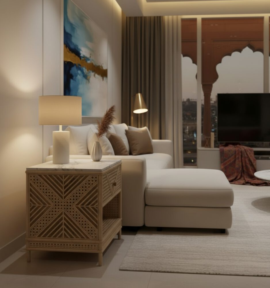 Crafted from sustainably sourced wood, the natural finish of this nightstand highlights the inherent beauty of the grain. The clean lines and the warm, inviting tone of the wood create a calming yet sophisticated presence, embodying Dhvij’s philosophy of furniture that feels alive and becomes a cherished conversation piece.