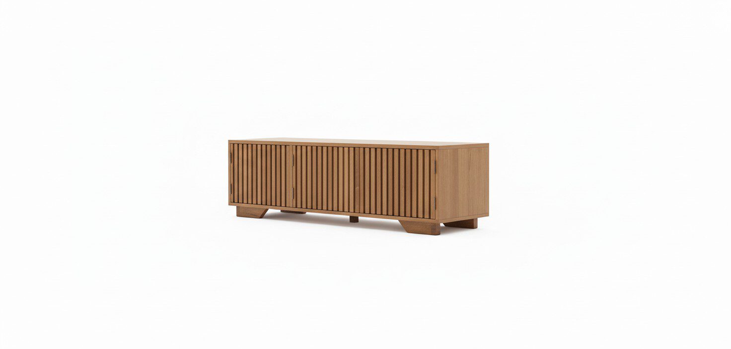 Experience the natural beauty and character of solid timber in this meticulously crafted sideboard. The warm, rich tone of the wood is enhanced by the striking vertical ribbing on the cabinet doors, a testament to our skilled artisans’ dedication to detail. Each panel is carefully shaped and fitted, creating a rhythmic pattern that is both visually captivating and tactilely engaging. The subtle, aged brass hinges add a touch of vintage elegance, harmonizing perfectly with the organic texture of the wood.