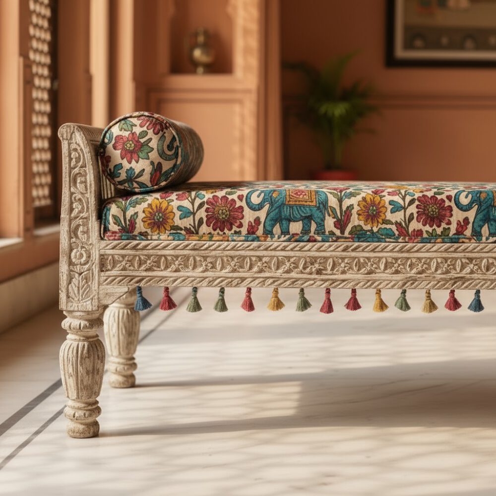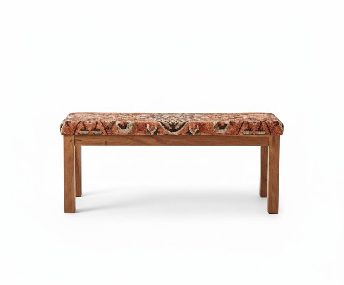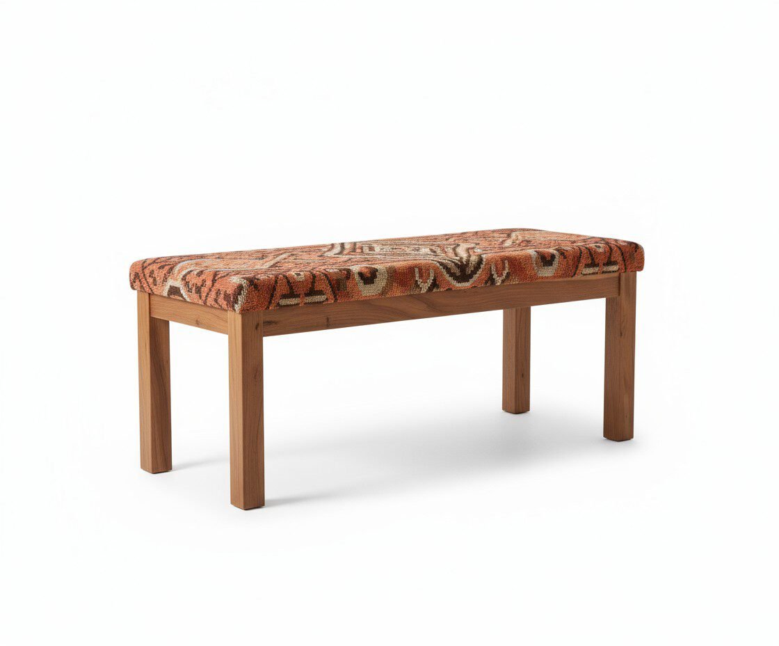 The true ‘showstopper’ lies in the richly patterned upholstery. The fabric, a captivating blend of earthy reds, deep blacks, and subtle creams, features a complex, almost tribal-inspired motif. This distinctive pattern is not merely a covering but a narrative woven into the very essence of the bench, promising to transform any room into a gallery of unique style and a hub of engaging conversations, perfectly embodying Dhvij’s philosophy of ‘alive’ furniture.