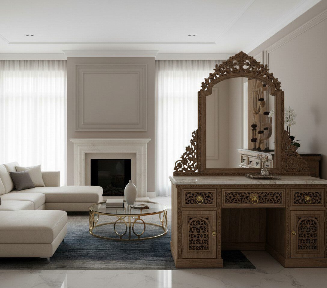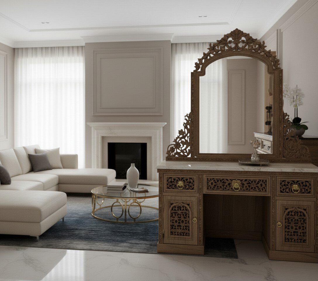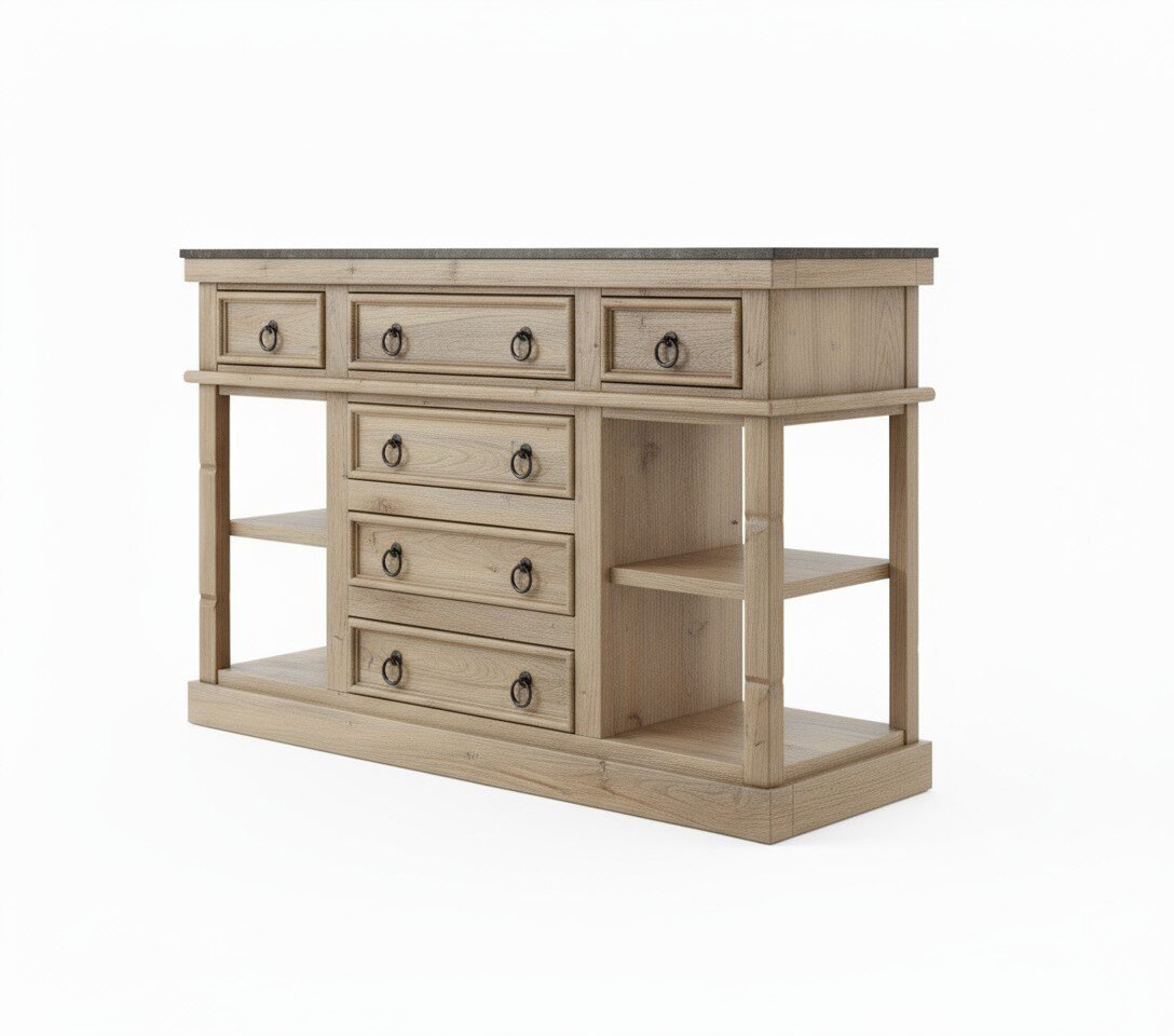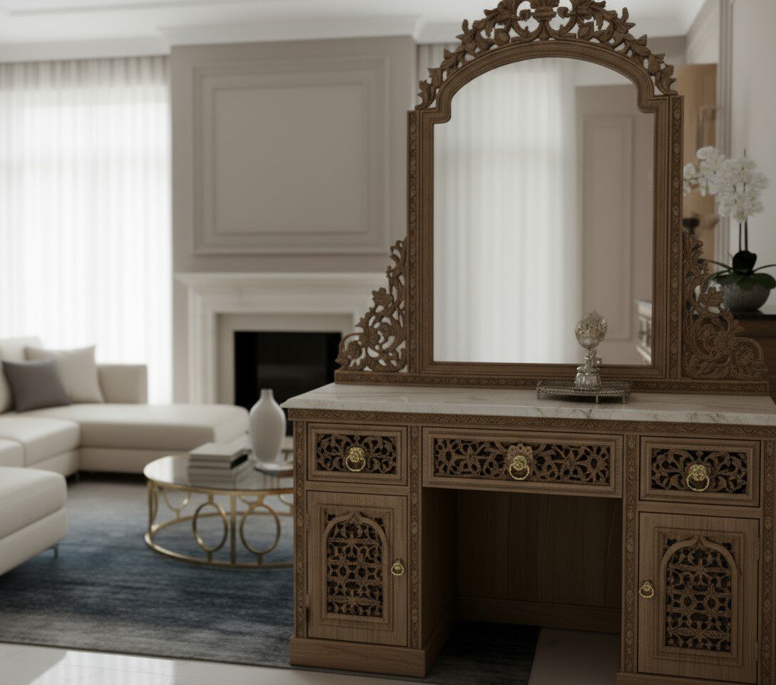 The Jodhpur Artisan Vanity is a testament to Dhvij’s commitment to bespoke designer furniture. Crafted from solid wood with a natural, raw finish, this piece showcases the inherent beauty of the material. The rich, dark stone countertop, with its subtle marbling, provides a striking contrast, creating a visual dialogue that is both sophisticated and grounding. Each of the seven drawers, adorned with simple yet elegant black ring pulls, is meticulously constructed, offering ample storage and a tactile delight.